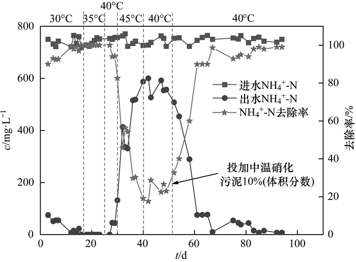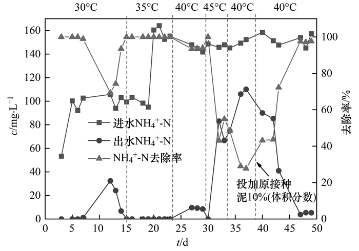 接種污泥取自前期試驗的中溫硝化污泥, 該污泥的MLSS、MLVSS和硝化活性分別為12.05 g ·L-1、7.48 g ·L-1、(62.5±5) mg ·(L ·h)-1.經過稀釋, 初始接種MLSS為4.5 g ·L-1左右, 反應器內pH在7.0~8.0, DO在2~4 mg ·L-1, 全程除采樣外不排泥.反應器內水溫變化分5個階段逐步提高:第一階段(1~15 d), 水溫30℃; 第二階段(16~22 d), 水溫35℃; 第三階段(23~29 d), 水溫40℃; 第四階段(30~41 d), 水溫45℃; 第五階段(42~94 d), 水溫為40℃.由于硝化系統未見好轉, 第52 d投加10%(體積分數)的原接種泥進行恢復.