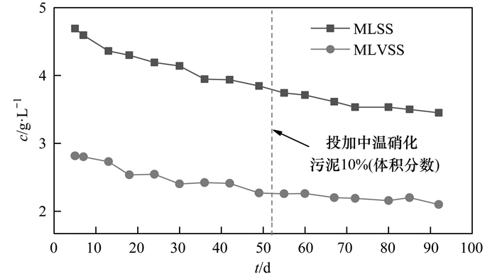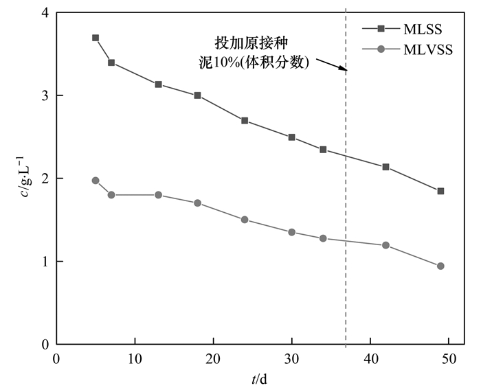 MLSS和MLVSS隨運行時間的延長而降低, 如圖 3所示.運行34 d后, MLSS從4 g ·L-1逐步下降至2.5 g ·L-1, 可能有兩方面原因:一方面, 接種污泥中含有異養菌, 而進水基質未添加有機碳源, 導致異養菌沒有足夠的營養物質進行生長; 另一方面, 試驗溫度最高為45℃, 有研究表明, 40℃以上會導致污泥絮體不易成團, 導致微生物游離, 部分微生物隨出水流失.第38 d重新投加了10%(體積分數)接種污泥, MLSS也出現相似的下降情況, 最終MLSS為2 g ·L-1, 但MLSS的降低并未影響氨氮去除率, 推測MLSS降低的主要原因為異養菌數量的減少.