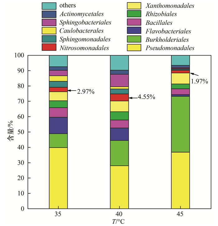 在不同溫度下, 2.1節的好氧池活性污泥中豐度前10的屬水平的微生物群落結構分布如圖 4所示.微生物的群落組成在中溫和高溫條件下有所不同, 這與文獻中報道相一致.不同溫度下的活性污泥的優勢菌屬均為假單胞菌屬(Pseudomonadales)和伯克氏菌屬(Burkholderiales), 但其含量差異大. Burkholderiales的含量隨溫度而升高, 35℃、40℃和45℃時, 其含量分別為9%、16%和36%. Burkholderiales是一種好氧菌, 具有較強耐鎘性, 其適應的生長溫度也較高, 有些研究者就分別在50℃和65℃進行此類菌的富集培養. Pseudomonadales生長迅速且能分解脂肪和蛋白質, 其含量在40℃時降低至28%, 但在45℃下部分細菌解體后的產物可能作為Pseudomonadales生長的營養物質, 使其含量又升高至37%.