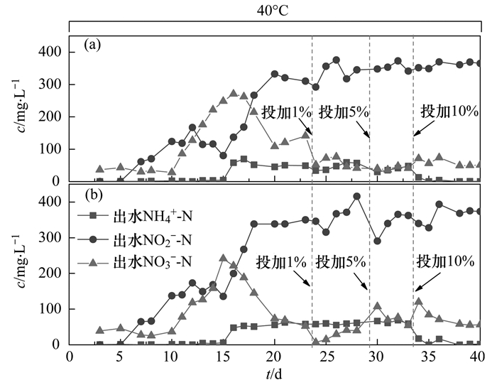 在40℃水溫下, 首先通過階梯式提高進水氨氮濃度, 給生物處理系統制造高氨氮沖擊. 1~15 d, 進水氨氮濃度為30~400 mg ·L-1, 第16 d起提高進水氨氮至(550±10) mg ·L-1.反應器A使用1.2節40℃馴化硝化污泥進行強化, 硝化活性(60±5) mg ·(L ·h)-1, MLSS為(3±0.5) g ·L-1; 反應器B使用本課題組同期研究中的中溫富集硝化污泥, 硝化活性和MLSS都與反應器A類似, 分別為(62.5±5) mg ·(L ·h)-1、(3.5±0.6) g ·L-1.在運行的第24 d、30 d和35 d分別投加為1%(體積分數)、5%(體積分數)和10%(體積分數)的馴化前后的中溫硝化污泥.