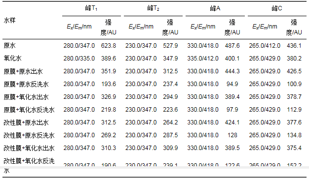 在上述過濾階段中分別取進水、出水與反洗水進行DOC與EEM的測定.在過濾進程中記錄過濾水樣體積與反洗水所用體積, 通過計算可以得到過濾進程中的碳平衡.表 3為臭氧-CNT膜改性聯(lián)用工藝中碳平衡結(jié)果, 通過觀察表 3能夠得出CNT改性后, 對有機污染物的截留比例增加, 反洗水中有機物的比例增加, 出水中有機物的比例下降.改性膜過濾原水時與原膜相比, 對有機物的截留比例提高2.4%、反洗中有機物比例提高1.2%、出水有機物比例下降3.6%;表明CNT改性后的膜組件納污能力增強, 膜表面能夠截留更多的DOC.經(jīng)臭氧氧化后, CNT改性層的作用更加明顯, 改性膜過濾氧化水時與原膜相比, 對有機物的截留比例提高4.4%、反洗中有機物比例提高2.1%、出水有機物比例下降6.5%, 說明臭氧氧化進一步加強了膜組件的可恢復(fù)性.結(jié)合圖 8中反洗后各片式膜組件的恢復(fù)情況, 筆者推測, 在使用原膜過濾時, 污染物容易附著在膜表面或堵塞膜孔, 導(dǎo)致TMP升高, 隨著過濾進程的推移, 在膜表面形成污染層, 水力沖洗僅能夠沖去部分污染層, 對膜內(nèi)部堵塞作用不大; 在使用CNT改性膜過濾時, 由于CNT層的存在, CNT層的吸附截留作用能夠提高膜組件的納污能力, 經(jīng)過反沖洗后, 沖去CNT層攔截的污染物質(zhì), 使得過濾TMP能夠恢復(fù)到較低的水平.