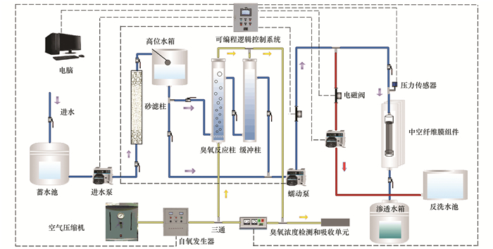 本實驗中膜組件改性、水體氧化和超濾實驗使用連續(xù)流裝置完成, 該裝置使用恒流-死端方式運行, 過濾水樣為實際污水二級出水.實驗設(shè)計4組平行實驗, 分別為:原水+原膜; 原水+CNT改性膜; 氧化水+原膜; 氧化水+CNT改性膜.實驗在室溫(20±1)℃下進行, 裝置流程如圖 1所示, 由砂濾單元, 臭氧預(yù)氧化單元, 膜濾單元和自控單元共4和單元構(gòu)成.二級出水經(jīng)過砂濾柱后, 一部分直接進入膜濾單元, 另一部分進入預(yù)氧化單元.臭氧預(yù)氧化單元內(nèi), 干燥空氣經(jīng)過空氣壓縮機(GC-ready SPB-2000, 北京北分索思科技有限公司)后進入臭氧發(fā)生器(LAB2B, 英國TRIOGEN), 并利用臭氧分析儀(UV-2100, 美國IDEAL)測定臭氧產(chǎn)量.臭氧由底部進入臭氧反應(yīng)柱, 與臭氧反應(yīng)后的水進入緩沖柱, 反應(yīng)柱與緩沖柱溢出的臭氧經(jīng)收集后由尾氣吸收裝置吸收.本實驗中臭氧投加量與CNT負載的選擇為0.22 mg·mg-1與3g·m-2, 詳細選擇原因請參考文獻, 膜組件改性的詳細方法參考文獻.本實驗主要研究在臭氧-CNT膜改性聯(lián)用工藝下膜組件閾通量的變化.自控單元主要由可編程邏輯控制器(programmable logic controller, PLC)和電腦構(gòu)成, 能夠?qū)崿F(xiàn)對電磁閥、蠕動泵、壓力傳感器、臭氧發(fā)生器、臭氧分析儀的自動控制和數(shù)據(jù)傳輸.通過自控單元可以對跨膜壓差(trans-membrane pressure, TMP)、進水通量、進水時間、反洗通量和反洗時間進行自動控制.