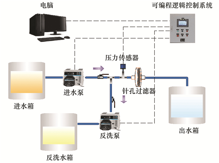 為了研究膜濾進程中的碳平衡, 更好地對進水、出水、反洗水進行收集與測定, 故設(shè)計一套小型PVDF片式膜過濾裝置研究使用. PVDF片式膜面積小, 具有使用水量小, 管路損失小的特點, 能夠更加精密地滿足實驗要求.片式膜過濾裝置工藝流程圖如圖 2所示.