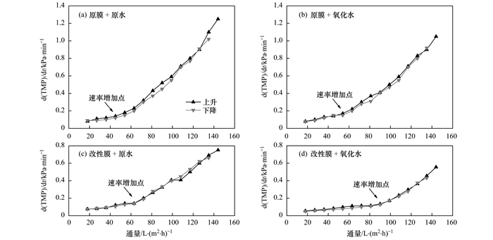 圖 5為圖 4中各個膜組件dTMP/dt, 得出各通量下TMP增長速率, 由于使用預(yù)壓縮階梯通量法, 所以在過濾進程中有通量上升和下降兩階段, 可以通過這兩階段數(shù)據(jù)是否一致來判斷, 得出數(shù)據(jù)的準確性.從中可以看出各個膜組件的TMP增長速率均有平緩上漲階段和加速上漲階段, 即其中標注出的速率增加點前后.觀察圖 5(a)在速率增加點前, TMP增長速率約為0.1 kPa·min-1, 速率增加點后TMP增長速率變化迅速, 在Jmax點已經(jīng)達到1.25 kPa·min-1; 觀察圖 5(b)在速率增加點前, TMP增長速率同樣約為0.1kPa·min-1, 但在Jmax點TMP增長速率達到1.05 kPa·min-1; 圖 5(c)、5(d)具有類似結(jié)果, 在速率增加點前TMP增長速率同約為0.1kPa·min-1, 而Jmax點TMP增長速率分別為0.75 kPa·min-1、0.5 kPa·min-1; 對比4圖中Jmax點TMP增長速率得到原膜+氧化水、改性膜+原水、改性膜+氧化水在Jmax運行時TMP增長速率相比原膜+原水膜組件分別減少了16%、40%、60%.表明臭氧-CNT膜改性聯(lián)用工藝與原膜相比能夠降低過濾進程中的壓力增長速率.
