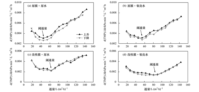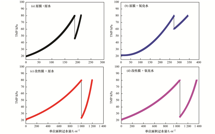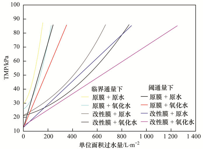 從圖 7中可見, 在相同過濾條件下, 閾通量運行得到的單位面積過水量大于臨界通量下運行.原膜+原水膜組件相比臨界通量, 閾通量下過水能力從157 L·m-2提升到242 L·m-2, 提高了54.3%;原膜+氧化水膜組件相比臨界通量, 閾通量下過水能力從226 L·m-2提升到352 L·m-2, 提高了55.3%;改性膜+原水膜組件相比臨界通量, 閾通量下過水能力從667 L·m-2提升到881 L·m-2, 提高了32.1%;改性膜+氧化水膜組件相比臨界通量, 閾通量下過水能力從858L·m-2提升到1250 L·m-2, 提高了45.6%;表明閾通量下能夠延長膜組件的過水能力, 閾通量下膜污染增長更緩慢.這說明, 在運行中閾通量具有更高的指導(dǎo)意義, 能夠保證膜組件運行更加穩(wěn)定.