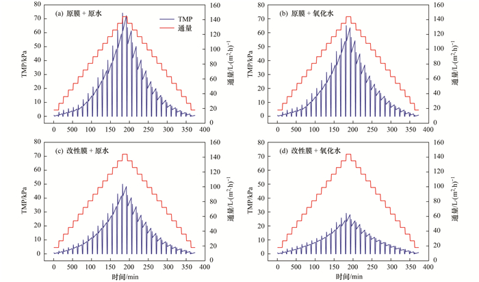 圖 4為使用預(yù)壓縮階梯通量法對膜組件進行壓力測試的TMP變化, 由圖 4(a)中可以看出, 在最大通量Jmax時, 膜組件TMP最大為72.3 kPa; 圖 4(b)中最大通量Jmax運行時, 膜組件TMP最大為63.5 kPa; 圖 4(c)中最大通量Jmax運行時, 膜組件TMP最大為48.3 kPa; 圖 4(d)中最大通量Jmax運行時, 膜組件TMP最大為28.1 kPa; 通過對比以上數(shù)據(jù)能夠得出, 原膜+氧化水、改性膜+原水、改性膜+氧化水在Jmax運行時TMP相比原膜+原水膜組件分別減少了12.2%、33.2%、61.1%.結(jié)果表明在預(yù)壓縮階梯通量法運行下, 改性膜+氧化水TMP增長最為緩慢, 抗污染性最強.