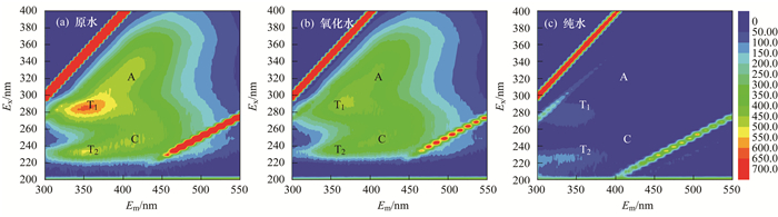 圖 10為對過濾進程中原水、氧化水、純水的EEM測定.表 4為運行過程中進水、出水和反洗水中主要污染物質(zhì)熒光峰位置及強度值.根據(jù)文獻[22, 23]對水中常見污染物熒光分析的研究得出T1、T2、A、C這4種主要物質(zhì), 其分別對應(yīng)色氨酸類蛋白、酪氨酸類蛋白、可見腐殖質(zhì)、UV腐殖類質(zhì).