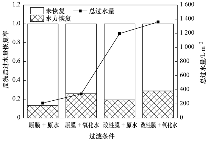 圖 8為片式膜PVDF過濾裝置純水反洗前后的TMP變化.可以觀察到反洗前TMP增長與前期實驗結(jié)果相同, 臭氧-CNT膜改性聯(lián)用工藝效果最佳.經(jīng)純水反洗后, 原膜過濾原水TMP恢復(fù)到45 kPa, 原膜過濾氧化水TMP恢復(fù)到55 kPa左右, 而CNT改性膜過濾原水與氧化水TMP均能夠恢復(fù)到20 kPa左右.這表明負載CNT能夠提高膜組件的水力恢復(fù)性能.根據(jù)反洗前后的過水量, 可以得到每個片式膜的水力反洗過水量恢復(fù)率, 如圖 9所示.從中可知, 原膜+原水、原膜+氧化水、改性膜+原水和改性膜+氧化水總過水量分別為212.1、341、1195和1360.2 L·m-2, 過水量恢復(fù)率分別為13.3%、25.8%、19.2%和28.6%, 即原膜+原水的過水量最少、恢復(fù)率最低, 改性膜+氧化水的過水量最多、恢復(fù)率最高.該結(jié)果表明, 臭氧-CNT膜改性工藝不僅能夠提高膜組件的抗污染性, 同時增加了反洗后的恢復(fù)率.