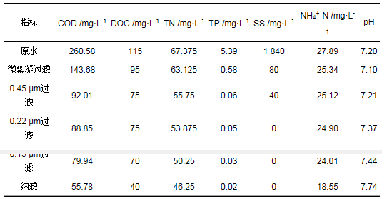 為避免無(wú)機(jī)顆粒對(duì)實(shí)驗(yàn)結(jié)果的影響, 取污水廠沉砂池出水為實(shí)驗(yàn)原始水樣, 其基本水質(zhì)情況見(jiàn)表 1.首先設(shè)計(jì)微絮凝過(guò)濾單元, 選擇工業(yè)上常用的精制硫酸鋁為絮凝劑, 目的在于降低原水的SS, 以減輕膜污染; 隨后設(shè)計(jì)膜逐級(jí)抽濾單元, 選擇常用的0.45、0.22和0.15 μm的醋酸纖維膜以及納濾膜, 探討不同級(jí)配的膜對(duì)污水中各類污染物的去除特性, 重點(diǎn)探討膜逐級(jí)抽濾對(duì)城市污水中有機(jī)物的篩分特性.