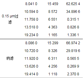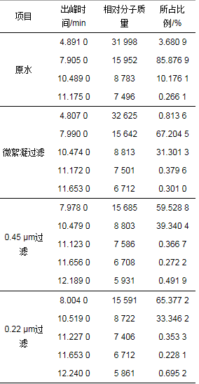本實(shí)驗(yàn)采用高效液相色譜法對(duì)原水及各級(jí)處理出水中溶解性有機(jī)物的相對(duì)分子質(zhì)量進(jìn)行測(cè)定, 通過(guò)相應(yīng)地線性換算, 其相對(duì)分子質(zhì)量分布情況如表 3.原水中溶解性有機(jī)物相對(duì)分子質(zhì)量分布范圍廣, 但主要集中在4個(gè)水平:大于30 000、15 000左右、8 500左右和小于7 500, 其占比分別為3.680 9%、85.876 9%、10.176 1%和0.266 1%.經(jīng)微絮凝處理后, DOC下降21%, 其中相對(duì)分子質(zhì)量大于30 000的溶解性有機(jī)物占比從3.680 9%下降至0.813 6%, 相對(duì)分子質(zhì)量在1 500左右的溶解性有機(jī)物占比從85.876 9%下降至67.204 5%, 說(shuō)明微絮凝對(duì)相對(duì)分子質(zhì)量大于15 000的大分子溶解性有機(jī)物有一定的去除效果.經(jīng)0.45 μm和0.22 μm的醋酸纖維膜抽濾后的出水, 其色譜圖幾乎相同.說(shuō)明兩者對(duì)溶解性有機(jī)物的去除特性相近, 這就是為何許多學(xué)者在研究溶解性有機(jī)物時(shí)會(huì)選擇0.45 μm和0.22 μm的微濾膜作前處理.經(jīng)0.45 μm的醋酸纖維膜抽濾后, DOC去除率在6.7%, 相對(duì)分子質(zhì)量大于30 000的溶解性有機(jī)物已全部去除.0.15 μm的醋酸纖維膜和納濾對(duì)溶解性有機(jī)物的去除效果顯著, DOC去除率分別為14.3%和41.7%.但所有相對(duì)分子質(zhì)量的占比變化卻不明顯, 說(shuō)明0.15 μm的微濾膜和納濾對(duì)溶解性有機(jī)物的去除特性與有機(jī)物相對(duì)分子質(zhì)量分布的相關(guān)性較小.具體聯(lián)系污水寶或參見(jiàn)http://www.bnynw.com更多相關(guān)技術(shù)文檔。