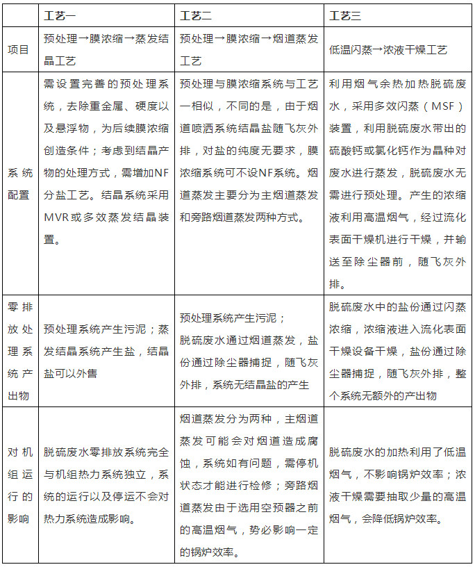 比較上述不同脫硫廢水零排放工藝,從各工藝的系統配置,優缺點以及對熱力系統的影響等方面進行說明。如下表所示: