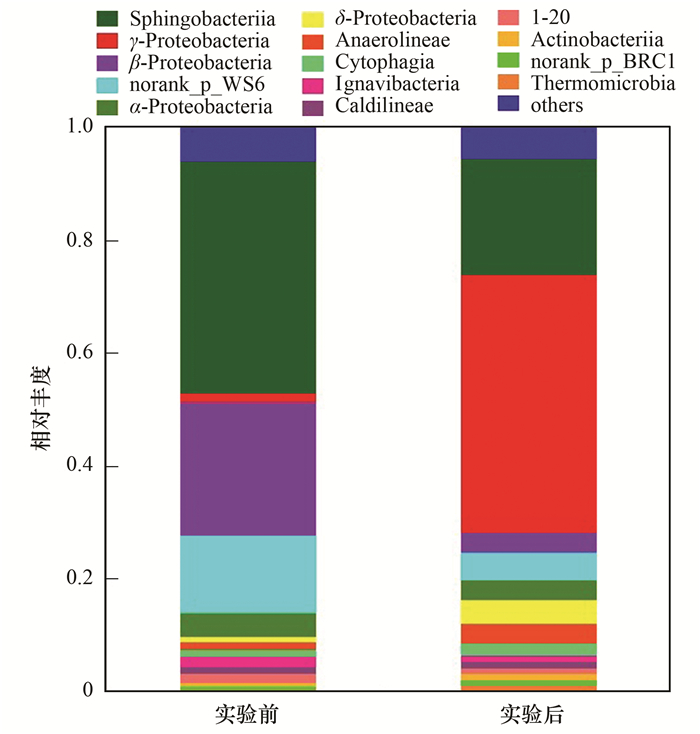 如圖 7,厭氧氨氧化系統實驗前后主要菌群均為Anaerolineae(厭氧繩菌綱)、norank_p_WWE3、β-Proteobacteria和Sphingobacteria綱. Anaerolineae綱是厭氧生物反應器中常見的微生物菌群,對比實驗前,實驗后厭氧氨氧化系統中Sphingobacteria綱有顯著增加,有研究表明[27]Sphingobacteria綱具有提高微生物生長速率和脫氮速率的功能,故從微生物角度解釋了實驗后厭氧氨氧化系統脫氮性能提高的原因.