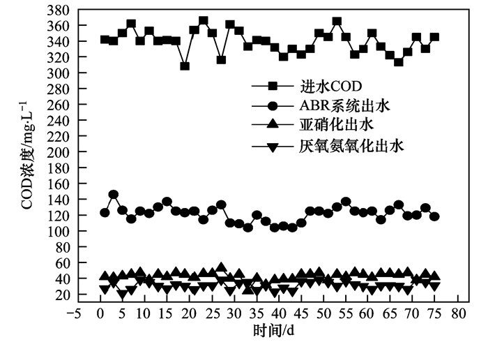 此外,如圖 5,厭氧氨氧化系統進水經亞硝化系統出水和ABR除碳系統出水混合后COD濃度在60~80 mg·L-1,出水COD濃度在20~40 mg·L-1,有機物并未對厭氧氨氧化產生不良影響.近年來,研究者在有機物對ANAMMOX影響方面展開了大量研究,150 mg·L-1以下有機物濃度可使異養菌與ANAMMOX菌共存,并達到相互促進的作用,這也是本實驗厭氧氨氧化系統能夠穩定運行的原因.