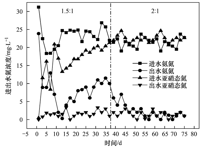 厭氧氨氧化系統的進水由亞硝化系統出水和ABR除碳系統出水兩部分組成,在一體式反應器啟動的前37 d中,控制亞硝化系統出水和ABR除碳系統出水比例為(1.5:1)、厭氧氨氧化系統HRT 4.5 h,如圖 4,此時厭氧氨氧化系統出水即一體式ABR除碳-亞硝化-厭氧氨氧化反應器出水NH4+-N呈現先下降后上升的變化,出水NO2--N一直處于較低水平(1~3 mg·L-1).這是因為本實驗厭氧氨氧化系統中接種的是培養成熟的厭氧氨氧化污泥,污泥活性良好,故接種后一體式反應器出現出水NH4+-N濃度迅速下降的現象;而ABR除碳系統出水中NH4+-N濃度為50 mg·L-1,NO2--N濃度為0 mg·L-1,而厭氧氨氧化系統進水中雖然亞硝化出水所占比例為ABR除碳系統的1.5倍,但是亞硝化出水中NO2--N濃度只有35 mg·L-1左右,且還存在6~10 mg·L-1左右的NH4+-N,經計算此時厭氧氨氧化進水中NO2--N:NH4+-N濃度為0.6~0.8:1,而目前,學術界普遍接受的厭氧氨氧化反應方程式如式(1)所示.從中可知,該反應NO2--N和NH4+-N消耗量的理論比為1.32:1,而本實驗厭氧氨氧化系統進水中NO2--N濃度所占比例較小,ANAMMOX菌長期得不到均衡的基質,故而出水NH4+-N濃度又出現上升的現象.