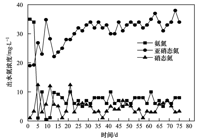 采用人工配水模擬城市污水,以(NH4)2SO4為氮源(NH4+-N濃度為50 mg·L-1左右),以乙酸鈉為碳源(COD濃度為300~400 mg·L-1),加碳酸氫鈉以調節pH至7.5左右.另外還包括生物所需的其他營養元素氯化鈣(10 mg·L-1)、硫酸鎂(10 mg·L-1)、磷酸氫二鉀(4 mg·L-1 )及微量元素.微量元素分為微量元素Ⅰ和微量元素Ⅱ,微量元素按照1 mL·L-1添加.微量元素Ⅰ組分(g·L-1):EDTA 5,FeSO4 5;微量元素Ⅱ組分(g·L-1):EDTA 15,ZnSO4·7H2O 0.43,CoCl2·6H2O 0.24,MnCl2·4H2O 0.99,CuSO4·5H2O 0.25,NaMoO4·2H2O 0.22,NiCl2·6H2O 0.19,NaSeO4·10H2O 0.21,H3BO40.014.