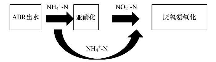 因為厭氧氨氧化反應的基質配比NH4+-N:NO2--N濃度為1:1左右,所以亞硝化和厭氧氨氧化的聯合工藝的關鍵在于如何實現穩定的部分亞硝化,而實現長期穩定的部分亞硝化十分困難.本實驗廢水先經ABR除碳系統除碳后,一部分ABR除碳出水進入亞硝化進行完全亞硝化,另一部分ABR出水直接進入厭氧氨氧化系統中與亞硝化出水合并作為厭氧氨氧化進水,工藝路線如圖 2.本工藝路線同樣可以保證厭氧氨氧化的進水中NH4+-N和NO2--N濃度比為1:1,而控制完全亞硝化比部分亞硝化要容易得多.