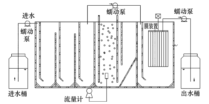 本實驗裝置由有機玻璃制成,如圖 1,總有效體積16.24 L,反應器長63 cm,寬8 cm,有效高度30 cm,由ABR除碳系統、CSTR亞硝化和MBR厭氧氨氧化系統組成. ABR系統每隔室升流區和降流區隔間寬度比為4:1,折流板導向角為45℃,有效容積為8.8 L.亞硝化系統為連續流完全混合式反應器,分為曝氣池和沉淀池兩部分組成,有效容積分別為2.64 L和0.96 L.厭氧氨氧化反應器中設置簾式中空纖維微濾膜組件,膜孔徑0.1 μm,膜面積為0.2 m2,有效容積為3.84 L. MBR厭氧氨氧化進水由ABR除碳系統出水和亞硝化出水兩部分組成,以此保證厭氧氨氧化進水NH4+-N:NO2--N濃度在1:1左右.一體式反應器通過蠕動泵連續進水,由蠕動泵經中空纖維微濾膜間歇抽吸出水,抽吸周期為10 min(8 min抽吸和2 min反沖洗).整個反應器始終置于恒溫水浴箱中,溫度控制在(30±1)℃.