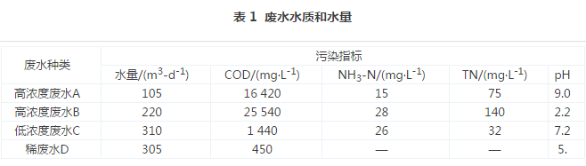 河北省某化工企業主要生產有機顏料,廢水來源主要是工藝廢水、廢氣吸收廢水、地面沖洗水、生活污水等。廢水按水質可以分為4大類:第1類為高濃度廢水A(COD高、鹽分低),主要來源于精制廢水、濾洗廢水、粗品車間廢水,主要污染物為COD、苯系物等;第2類為高濃度廢水B(COD高、鹽分高),主要來源于結晶過濾廢水、濾洗廢水、精餾塔頂流出液、廢氣吸收廢水、粗品車間廢水、母液,主要污染物為COD、苯系物、二氯乙烷、二甲基甲酰胺、水合肼、鹽分等;第3類為低濃度廢水C,主要來源于消化廢水、水沖泵廢水、地面沖洗廢水、蒸餾放料槽廢水、蒸汽尾水、生活污水,主要污染物為COD、SS、氨氮、總磷、苯系物等;第4類為稀廢水D,主要來源于產品洗水,主要污染物為COD、SS等。根據廢水水質不同先分質處理,再合并處理。最終處理出水執行《污水排入城鎮下水道水質標準》(CJ 343—2010)的B等級標準。各類廢水水質水量如表 1所示。