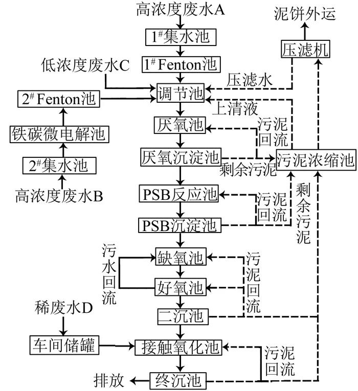 有機顏料生產廢水污染物種類多,結構復雜,含有較多大分子難降解的基團,且水量水質波動大,COD、有機氮、鹽分濃度較高,屬于典型的難降解有機廢水。目前,對于顏料廢水的治理主要采用厭氧+好氧為主的生化法,預處理和深度處理最常用的是混凝沉淀和Fenton氧化,其他還包括化學沉淀、過濾、吸附、電解、膜分離等。河北省某化工企業主要生產有機顏料,在生產過程中產生了大量有機顏料廢水。本工程基于顏料生產企業的要求,以及段云霞等的研究成果,根據不同水質特點分別采取了鐵碳微電解、Fenton氧化、光合細菌、生化反應等工藝對污水進行治理,在保證達標排放的前提下,最大程度降低了運行成本。工程調試完成后,整個污水治理系統運行穩定,各項出水指標優于預期要求。