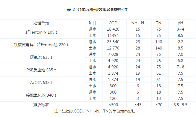 電費:電價0.7元/(kW˙h),電費成本2.82元/m3。人工費:3人,平均每人3 000元/月,人工成本0.32元/m3。藥劑費:聚丙烯酰胺消耗量0.1 kg/m3,聚丙烯酰胺成本0.86元/m3;雙氧水消耗量10 kg/m3,雙氧水成本3.10元/m3;硫酸亞鐵消耗量1 kg/m3,硫酸亞鐵成本0.17元/m3;硫酸消耗量1 kg/m3,硫酸成本0.17元/m3;鐵碳微電解填料消耗量0.4 kg/m3,填料成本1.17元/m3;液堿消耗量7 kg/m3,液堿成本1.94元/m3;復配劑消耗量0.5 kg/m3,復配劑成本3.5元/m3;營養劑成本0.8元/m3;PSB系統光合細菌培養成本0.3元/m3;自來水成本0.13元/m3。綜合電費、人工費、藥劑費,總運行成本15.28元/m3。