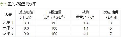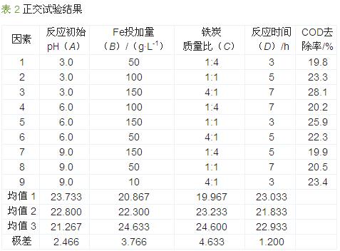 根據(jù)微電解試驗(yàn)原理,影響其處理效果的因素主要有Fe的投加量、鐵炭質(zhì)量比、初始反應(yīng)pH和反應(yīng)時(shí)間等,擬建立4因素3水平的正交試驗(yàn),考察各因素對(duì)處理效果的影響程度并初步確定最佳反應(yīng)條件。正交試驗(yàn)因素水平見表 1,正交試驗(yàn)結(jié)果見表 2。