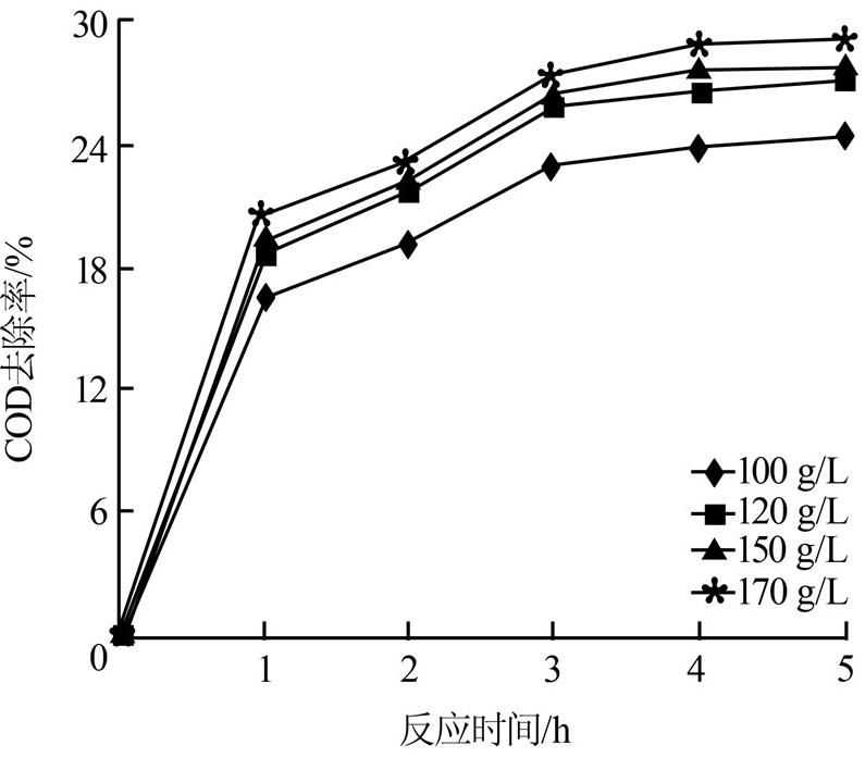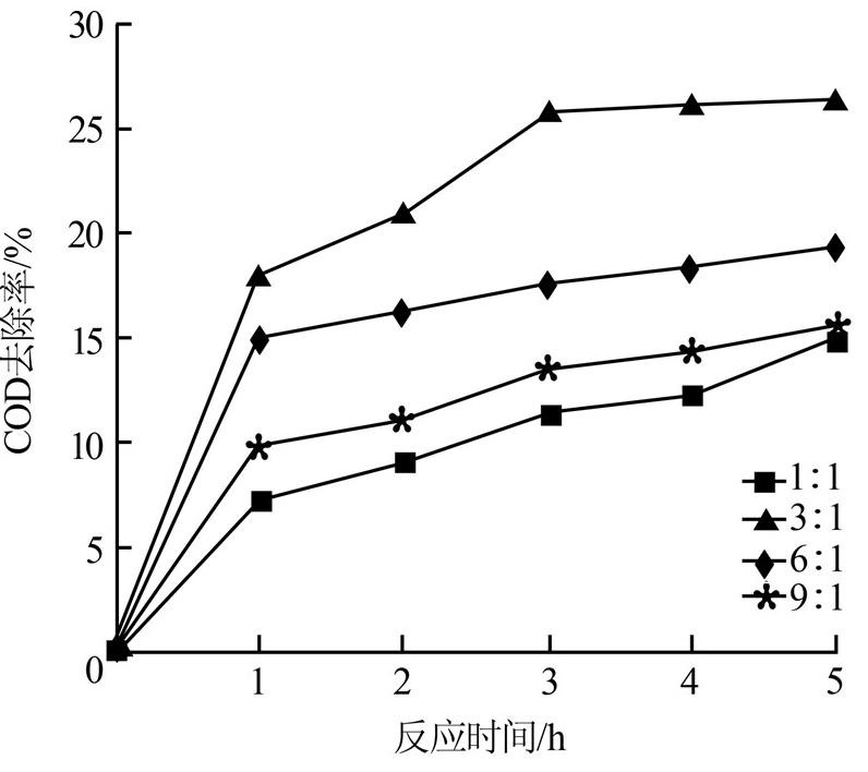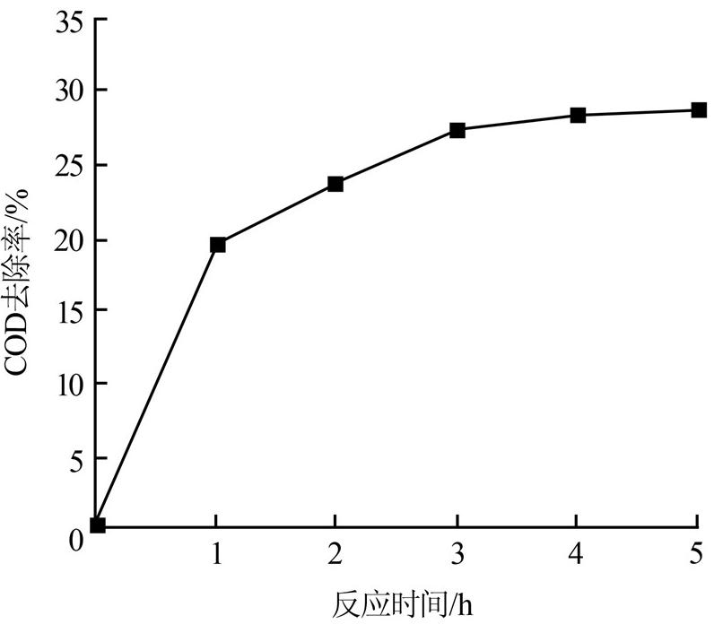 由圖 4可見,隨著反應(yīng)時(shí)間的增加,COD去除率逐漸升高,反應(yīng)時(shí)間為3 h時(shí)COD去除率為27.5%,繼續(xù)延長(zhǎng)反應(yīng)時(shí)間COD去除率增幅較小,綜合考慮成本確定最佳反應(yīng)時(shí)間為3 h。