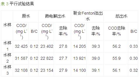 微電解最佳反應(yīng)條件為鐵炭質(zhì)量比3∶1、Fe投加量120 g/L、反應(yīng)初始pH 3.0、反應(yīng)時(shí)間3 h;聯(lián)合Fenton氧化法確定最佳反應(yīng)條件為H2O2投加量4 mL/L、反應(yīng)時(shí)間60 min。為驗(yàn)證上述工藝條件下廢水處理效果的穩(wěn)定性,分別采集3批水樣進(jìn)行最佳試驗(yàn)條件下的平行試驗(yàn),結(jié)果見表 3。