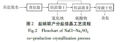 當(dāng)廢水中不存在占比較大的優(yōu)勢(shì)鹽組分時(shí),采用直接蒸發(fā)結(jié)晶工藝最終得到的純鹽回收率較低,雜鹽產(chǎn)量大,固廢處置費(fèi)用高。為了解決這一問題,可采用硫酸鈉和氯化鈉分步結(jié)晶的方式,分別在較高溫度下結(jié)晶得到硫酸鈉,在較低溫度下結(jié)晶得到氯化鈉,此工藝稱為鹽硝聯(lián)產(chǎn)工藝,其原理如圖2所示。