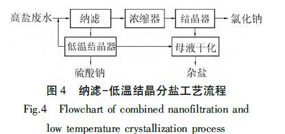 圖4 是一種納濾與低溫結(jié)晶耦合實(shí)現(xiàn)硫酸鈉和氯化鈉的分離和結(jié)晶的分鹽結(jié)晶工藝流程。經(jīng)過預(yù)處理的高鹽廢水進(jìn)入在室溫下運(yùn)行的納濾系統(tǒng),納濾濃水中的硫酸鈉被濃縮至7%以上,之后降溫至接近0 ℃后進(jìn)入低溫結(jié)晶器,結(jié)晶后經(jīng)固液分離得到十水硫酸鈉結(jié)晶鹽,部分低溫結(jié)晶器上清液送回納濾系統(tǒng)進(jìn)口循環(huán)處理。納濾透過液經(jīng)高壓反滲透或蒸發(fā)濃縮器濃縮后進(jìn)入高溫結(jié)晶器,結(jié)晶得到氯化鈉固體。從低溫結(jié)晶器和高溫結(jié)晶器排出的母液干化后得到雜鹽。