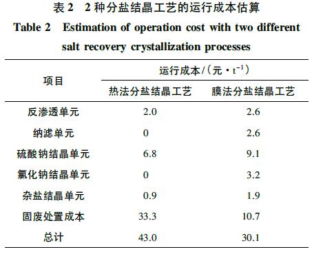 如第2.1節(jié)所述,熱法分鹽結(jié)晶工藝實(shí)現(xiàn)了硫酸鈉組分的部分資源化,回收了63.5%的硫酸鈉,結(jié)晶鹽產(chǎn)品綜合回收率44.4%。相較于完全得到雜鹽的零排放工藝而言,雜鹽產(chǎn)量已有大幅降低。但由于原水組成限制了硫酸鈉回收率的進(jìn)一步提高,同時(shí)也未能實(shí)現(xiàn)氯化鈉的回收,因此綜合回收率較低。第2.2 節(jié)所述的膜法分鹽結(jié)晶工藝將硫酸鈉的回收率提高至89.6%,同時(shí)回收了83.3%的氯化鈉,結(jié)晶鹽的綜合回收率達(dá)到82.2%。綜合來看,膜法分鹽結(jié)晶工藝在技術(shù)性能上較熱法分鹽結(jié)晶工藝具有較明顯的優(yōu)勢(shì)。