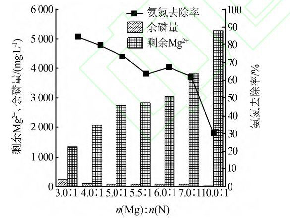 從表1可見,該脫硫廢水中的Mg2+含量非常高,過高的Mg2+會降低氨氮去除效果,因此有必要研究初始Mg2+濃度對MAP沉淀法去除氨氮的影響。投加NaOH(顆粒狀)控制反應(yīng)pH為8.5,在n(P):n(N)為1.5:1,n(Mg):n(N)分別為3.0:1,4.0:1,5.0:1,5.5:1,6.0:1 ,7.0:1 ,10:1條件下進行實驗,結(jié)果如圖2所示。