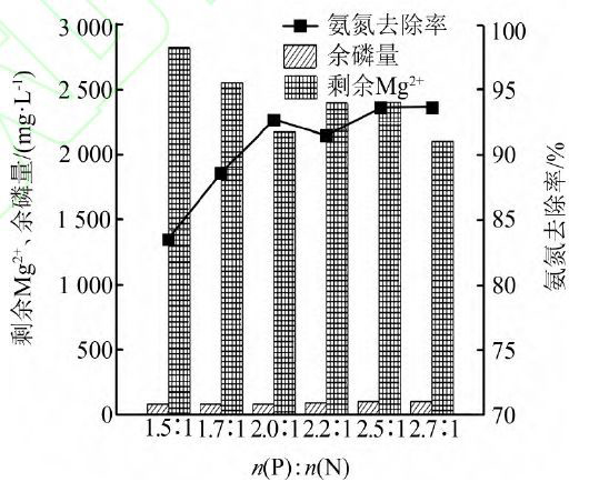 由于磷酸鹽試劑價格較高,其投加量對脫硫廢水氨氮處理工藝經(jīng)濟性的影響不容忽視。實驗選用NaH2PO4作為磷源來調(diào)節(jié)n(P):n(N)。在反應(yīng)PH為8.5, n(Mg):n(N)為5.0:1的條件下,通過理論計算選擇n(P):n(N)分別為1.5:1,1.7:1,2.0:1,2.2:1,2.5:1、2.7:1進行實驗,實驗結(jié)束后靜置沉淀20 min,過濾上清液進行測定,實驗結(jié)果見圖3。