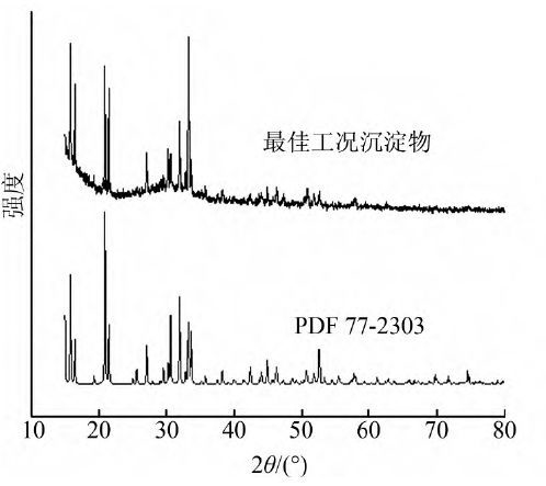從圖4可知,沉淀物的主要特征衍射峰分別在15.75° ,16.50° ,20.78° ,21.39° ,33.32°。采用SearchMatch軟件對所得譜圖進行分析,發(fā)現(xiàn)該沉淀物譜圖與磷酸銨鎂鹽標準PDF卡片77- 2303較為吻合。