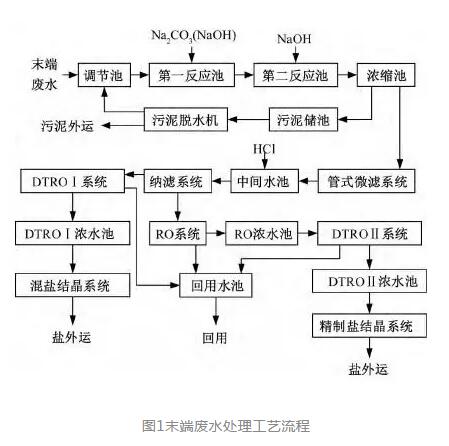 某火力發電廠建有2×600MW亞臨界純凝濕冷燃煤機組,原生產用水水源為地表水和某鋼鐵公司綜合廢水處理站再生水,其中地表水作為鍋爐補給水水源,鋼鐵公司再生水作為循環冷卻水系統補充水及其他工業用水水源。電廠引入城鎮污水處理廠再生水,與鋼鐵公司綜合廢水處理站再生水一起作為電廠生產用水水源,并配套建設再生水石灰處理系統和循環水排污水深度處理系統,鍋爐補給水水源由地表水替換為循環水排污水深度處理系統反滲透產水。電廠進行了排水的梯級利用,主要是將循環水排污水深度處理系統超濾反洗排水回收入工業廢水處理系統處理后回用,反滲透濃水回用作為脫硫系統工藝水補充水,脫硫廢水作為渣冷卻水補水等。但是依然有部分循環水排污水深度處理過程中的反滲透濃水、脫硫廢水及樹脂再生廢水等無法再次利用。該廠對難以完全消納的廢水進行處理,采用的工藝為化學軟化-管式微濾-納濾-(反滲透)-碟管式反滲透-蒸發結晶,工藝流程如圖1所示。末端廢水水質如表1所示。