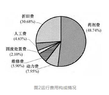 項目總運行費用為33.89元/m³,其中藥劑費為17.60元/m³,動力費為2.87元/m³,折舊費為8.86元/m³,維修費為2.13元/m³,人工費為1.67元/m³固體廢物處置費為0.76元/m³。運行費用各部分占比如圖2所示。其中藥劑費所占比例最大,接近一半,其次是折舊費,兩者合計約占總運行費用的79.42%。