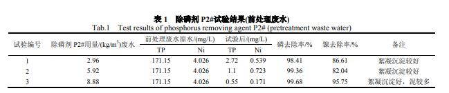 試驗(yàn)結(jié)果見表 1 和表 2。對(duì)于電鍍廢水廠前處理廢水,如果從磷去除率和除磷藥劑成本兩方面考慮,石灰較好。但除磷劑 P2#能夠?qū)⒘捉档?1 mg/L 以下,而石灰很難。除磷劑 P2#在去除鎳方面優(yōu)勢(shì)明顯。