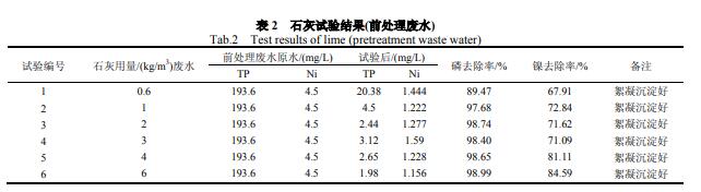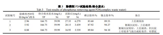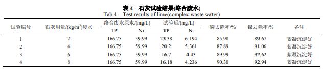 試驗(yàn)結(jié)果見表 3 和表 4。對(duì)于電鍍廢水廠絡(luò)合廢水,如果從磷去除率和除磷藥劑成本兩方面考慮,石灰較好。但除磷劑 P2#在除鎳方面更好。