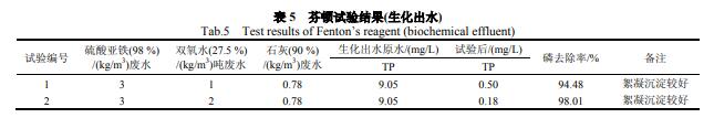 試驗(yàn)結(jié)果見表 5。對(duì)于電鍍廢水廠生化出水,采用芬頓氧化化學(xué)沉淀法,可以將 TP 降到 0.5 mg/L 以下。