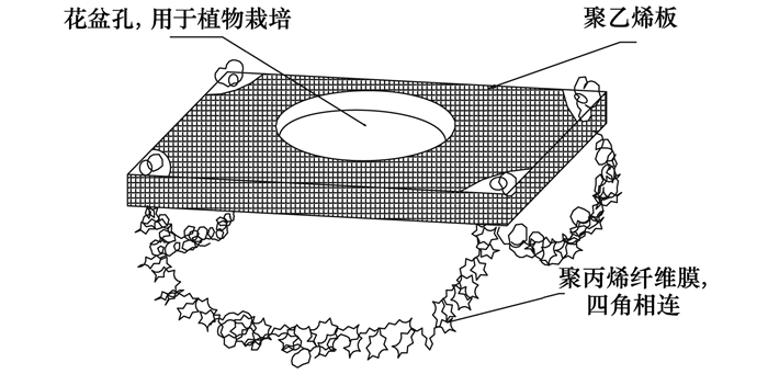 浮床床體為聚乙烯板, 其4個角各有一個圓孔用來連接已經噴上菌膠液的纖維膜(圖 3).纖維膜采用聚丙烯材料, 它具有很強的散熱性能, 對水的阻力較小, 布水、布氣性能好, 有益于微生物的生長, 同時又具有切割氣泡的作用.根據河道深度, 按照比例截取生物膜長度.中間為直徑10 cm的小孔, 用于后期栽培植物, 美化河道環境.