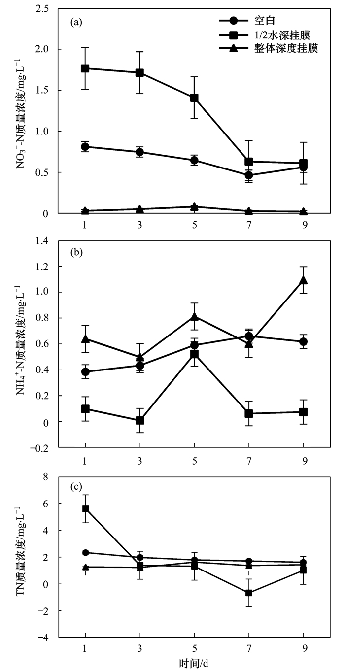 從圖 4(b)可以看出, 空白河道的NH4+-N濃度有一定的上升趨勢, 但變化不太明顯.懸掛1/2水深生物膜的河道內NH4+-N在前3 d處于下降趨勢, 濃度從0.098 mg ·L-1降低到0.009 mg ·L-1, 而在第5 d時NH4+-N值上升到了0.522 mg ·L-1之后又降低到0.062 mg ·L-1, 到第7 d后趨于穩定, 說明NH4+-N值在第5 d出現較大波動, 但整體變化不明顯.而整體水深懸掛生物膜的河道在第3 d和第7 d NH4+-N濃度出現拐點, 濃度值分別為0.498 mg ·L-1和0.601 mg ·L-1, 河道內初始NH4+-N值為0.639 mg ·L-1, 在第9 d時已經上升到1.093 mg ·L-1, 整體來看濃度處于上升趨勢.結果表明, 在空白河道內NH4+-N值有所上升主要是因為河道內微生物的自身代謝較微弱, 隨著時間的增加, NH4+-N不斷積累.在懸掛生物膜的河道, 水中氮素的轉化在缺氧條件下主要進行的是氨化作用, 有學者研究表明:氨化作用對溶解氧要求很廣泛, 厭氧或好氧條件下均可進行.而硝化及反硝化細菌主要是好氧自養型細菌, 由于河道下部溶解氧濃度較低并且懸浮類有機物及藻類較少, 從而影響NH4+-N的轉化.Cooper等[27]的研究指出, DO含量下降, 氨氮轉化的效率不超過15%.因此, 整體掛膜河道中的NH4+-N濃度出現上升趨勢.