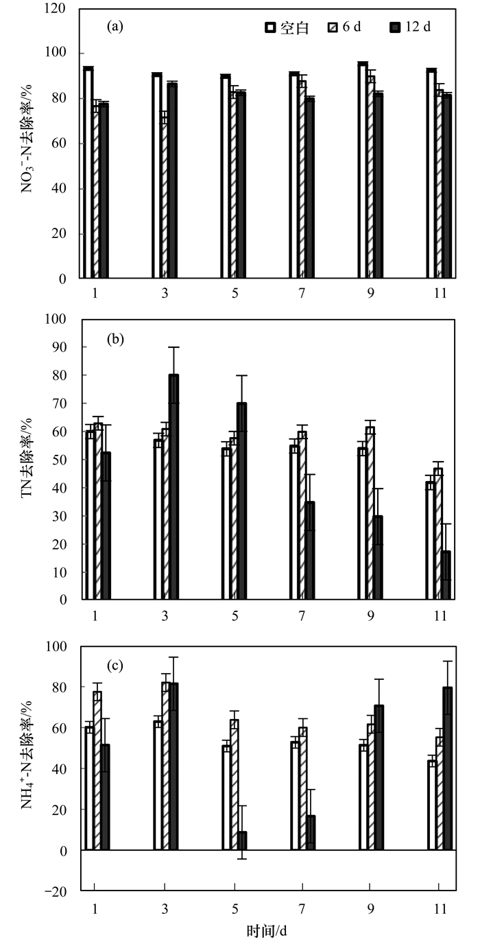由圖 5(a)可以看出, 在不同HRT條件下NO3--N去除率均維持在80% ~90%, 而空白河道的NO3--N去除率達到了90%以上, 這與苑泉等的研究HRT分別為12、8和4 h時, 對NO3--N去除率影響不大, 均能達到90%以上的結果相一致.說明在不同HRT條件下, 附著微生物生物浮床的同步硝化反硝化作用對于NO3--N的去除效率都較高, 且空白河道NO3--N的去除主要依靠河道內藻類和其他微生物代謝[30].從圖 5(b)和5(c)可以看出, 在HRT為6 d時, TN的去除率總體維持在60%左右, NH4+-N去除率能達到70%左右, 而在HRT為12 d時, NH4+-N及TN的去除率波動性較大, TN的去除率最高可達79.93%, 最低到17.23%, NH4+-N的去除率最高可達81.4%, 最低到8.73%.有研究表明, HRT較長會使生物膜脫落, 填料上附著態微生物轉化為懸浮態微生物.試驗結果說明, 當HRT為6 d時, 生態浮床上的微生物可充分與水體接觸且相對穩定, 能較好地發揮作用, 對于去除水中氮素的去除效果更明顯.