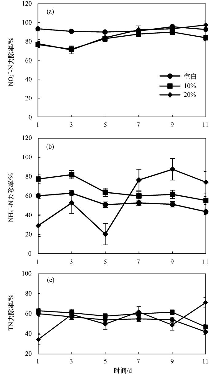 由圖 6(b)可以看出:在生物浮床覆蓋面積為10%時, 覆蓋面積較小, 微生物數量少, 而水中NH4+-N的去除效率在逐步降低, 且和空白河道變化趨勢相同, 說明當生物量較小時, 隨著時間的增加, 水中的硝化細菌的轉化效率減弱, 但在生物浮床覆蓋面積為20%時, 在初期由于微生物濃度的急劇增加, 產生了一定的抑制作用, 使得NH4+-N去除效果有所下降, 但隨著時間的增加, 水中NH4+-N的去除效率在不斷增加, 去除率達到了87.62%.有學者研究表明, 成倍加入人工掛膜的浮床對于水中NH4+-N的去除有很明顯的作用.因此, 生物浮床覆蓋面積為河道的20%時對水中NH4+-N的去除效果較好.從圖 6(c)可以看出, 在生物浮床覆蓋面積為10%和20%時, TN最高去除率分別為62.88%和71.09%, 但在覆蓋面積為10%時TN的去除率是呈下降趨勢, 而覆蓋面積為20%時TN的去除率是呈上升趨勢的.而從圖 6(a)結果中不難發現, NO3--N的去除效率都達到80%以上, 但覆蓋生物浮床河道去除率是呈現上升趨勢.結果表明, 由于生物浮床的覆蓋面積增加, 作用于水體的氨化、硝化和同步硝化反硝化細菌的生物量相應地增加, 活性增強, 因此, 當生物浮床面積為20%時對含氮尾水中氮素的去除具有明顯效果.