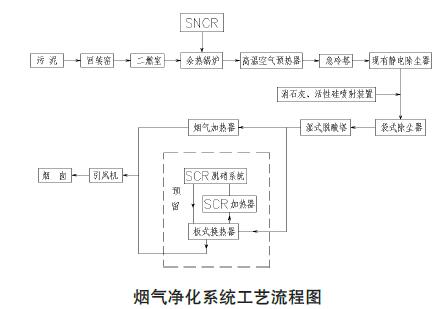 煙氣凈化采用“選擇性非催化還原脫硝SNCR+靜電除塵器(利舊)+袋式除塵+濕法脫酸+煙氣加熱”的集成工藝。原有靜電除塵器利舊,新增選擇性非催化還原脫硝SNCR、活性硅噴射裝置、濕法脫酸塔、煙氣加熱器等主體設備,重點解決粉塵、NOx、SO2等參數的達標問題。工藝流程如下圖。