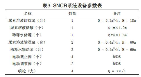 第一階段由于所燒物料性質的原因,通過SNCR脫硝系統,基本可滿足排放標準要求,但同時要預留好SCR脫硝系統接口,以備后續升級改造之需。SNCR脫硝系統的設備參數見表3。
