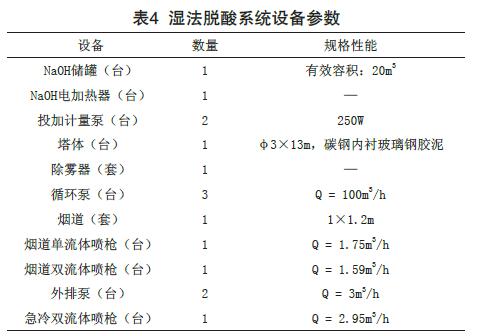 洗滌塔出口煙氣溫度為60℃~70℃,經煙氣加熱器加熱至120℃左右后經引風機、煙囪排放。濕法脫酸系統設備參數見表4。