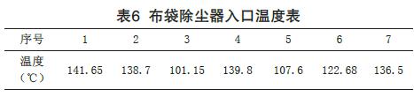 高溫煙氣經急冷塔冷卻后進入布袋除塵器,溫度為180℃~190℃,同時煙氣中的SO3在高含水率(31%)條件下對設備具有一定的腐蝕性。鑒于此,除塵器的濾料選擇為PTFE和PTFE覆膜,這種材質具有抗酸抗堿、抗各種有機溶劑的特點,并且耐高溫,連續運行時可達250℃,瞬時溫度可達280℃,要求急冷塔必須將煙氣溫度降至250℃以下。該系統目前通過噴淋量的調節控制急冷塔出口煙氣溫度在200℃以下,布袋除塵器入口溫度通常控制在150℃以下(跟所燒物料的熱值相關,若熱值較高,控制溫度也可適當提高),并設有溫度報警,若溫度高于180℃,則高溫報警,采取緊急措施,防止煙氣溫度過高損傷濾料。布袋除塵器入口溫度見表6。