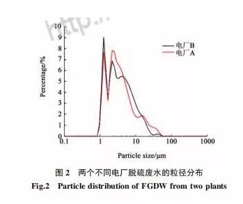 石灰石-石膏濕法脫硫采用石灰乳循環(huán)吸收煙氣中的SO2,吸收過程生成石膏,為保障石膏品質(zhì),一般采用Cl-濃度進行控制(控制限值一般為20 000 mg /L) ,定期排出一定量的脫硫廢水并補充新鮮吸收液。隨著脫硫吸收液的循環(huán)濃縮,脫硫廢水主要特征如表1所示:1)懸浮物含量高(SS:5. 0 ~ 80. 7 g /L) ,其主要組成為微米級的硫酸鈣和亞硫酸鈣粒子,沉降性能差(圖2) ;2)鹽含量 高(TDS:18. 1 ~ 121. 5 g /L) ,主要離子為Na+、Ca2+、Mg2+、Cl-、F-、SO2-4和SO2-3等,屬于高鹽廢水,雖然排放標準(火電廠石灰石-石膏濕法脫硫廢水水質(zhì)控制指標DL /T997-2006)對常規(guī)離子暫時未做限制;3)多種重金屬超標;4)還原性含硫物質(zhì)是COD的重要組成;5)受煙氣成分變動、吸收液用水的水質(zhì)差異、脫硫系統(tǒng)管理難控制等限制,脫硫廢水的水質(zhì)和水量波動顯著,對處理工藝的適應性提出了更高要求。