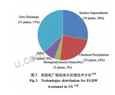 脫硫廢水中大量含硫物質(zhì)可以促進硫酸鹽還原菌(sulphate reduction bacteria,SRB) 的生長和生物氧化還原過程,有機物可以作為微生物的生長基質(zhì),因此,微生物法可以有效去除脫硫廢水中的有機物、硫酸鹽、氮和某些重金屬。美國EPA的調(diào)查結(jié)果顯示,美國有3%的電廠采用生物技術(shù)處理脫硫廢水( 圖3) 。Chao等用結(jié)合硫代謝的生物降解-電子轉(zhuǎn)移工藝 (Biodegradation-Electrontransfer with sulfur metabolism integrated process,BESI) 處理脫硫廢水,通過SRB作用,COD、TOC、氨氮和總氮的去除率分別為87. 99%、87. 04%、30. 77%和45. 17%。陳濤等考察了上流式厭氧污泥床反應器(UASB) 的脫硫廢水處理效果,利用SRB作用,可在高負荷條件下(SO2-4負荷為6 kg·m-3·d-1) 有效去除78%的COD和82%的SO2-4。人工濕地和流化床技術(shù)也在脫硫廢水處理中得到推廣應用,主要是利用植物和催化劑的作用去除某些重金屬。此外,直接將脫硫廢水排放至除灰系統(tǒng)、進行煤場噴灑、或灰渣閉式循環(huán)系統(tǒng)排放也是解決脫硫廢水的方案之一,利用余熱蒸發(fā)廢水實現(xiàn)零排放而結(jié)晶鹽作為灰渣處理,但存在突出的腐蝕風險。