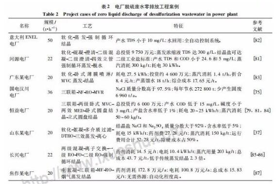 脫硫廢水零排放處理技術(shù)經(jīng)過了以下3個階段:第1階段是直接蒸發(fā),直接利用蒸發(fā)塘或者灰場、煤場等余熱進行蒸發(fā),但存在突出的危廢處理處置難題。第2階段是煙道噴霧蒸發(fā),利用煙道氣高溫進行廢水蒸發(fā)與廢鹽排除,可部分回收冷凝水。在煙道內(nèi)噴霧蒸發(fā)的基礎上又開發(fā)了旁路煙道蒸發(fā),以解決蒸發(fā)效率低和結(jié)垢問題。第3階段是蒸發(fā)結(jié)晶,通過“預處理+重金屬去除+濃縮減量+鹽結(jié)晶”組合工藝實現(xiàn)污染物的去除和鹽結(jié)晶,進而實現(xiàn)水回用和鹽回收,已成為目前研究最多的零排放工藝,其中膜分離技術(shù)與蒸發(fā)結(jié)晶技術(shù)的結(jié)合日益廣泛。零排放技術(shù)目前已經(jīng)實現(xiàn)了工業(yè)應用的突破(表2)。美國有37%的電廠實現(xiàn)零排放,但主要采用煙道霧化蒸發(fā)或旁路煙道蒸發(fā)技術(shù)。河源電廠是我國第一家真正意義上實現(xiàn)脫硫廢水零排放的電廠,其采用“軟化+兩級混凝澄清+四效蒸發(fā)”工藝,實現(xiàn)了水回用和結(jié)晶鹽回收。整體而言,目前傳統(tǒng)的零排放工藝仍然在電廠中有大量的應用。但隨著環(huán)保要求的提高,煙道蒸發(fā)和蒸發(fā)結(jié)晶逐漸得到推廣,基于“預處理+膜濃縮+蒸發(fā)結(jié)晶”的組合工藝成為零排放的最主要選擇。