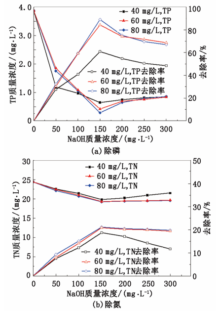 MgCl2 為除磷劑,投加量分別為 40、60、80 mg / L。結果表明: NaOH 質量濃度分別為 0、50、100、150、200、 250 和 300 mg / L 時,pH 值分別為 7. 84、8. 68、9. 15、 9. 27、9. 39、9. 45 和 9. 69。除磷脫氮效果見圖 1。